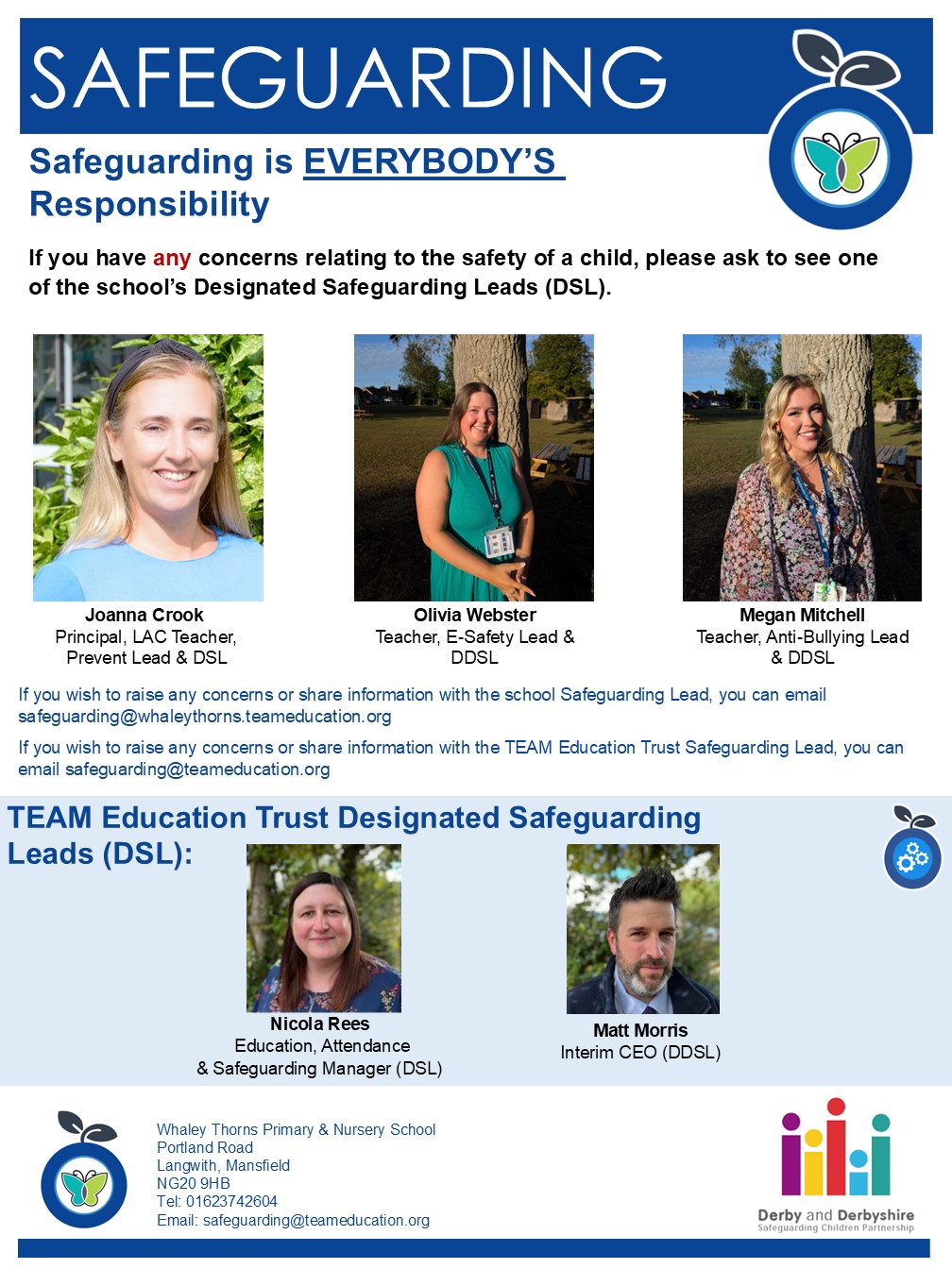 At Whaley Thorns Primary School we all work incredibly hard to make sure our school is a welcoming place for the whole school community, where children's wellbeing, mental health and safety are our top priorities. Our Designated Safeguarding Lead is Mrs Butcher and Mrs Crook is the Deputy Designated Safeguarding Lead. Nicola Rees is the Safeguarding Manager at TEAM Education Trust.